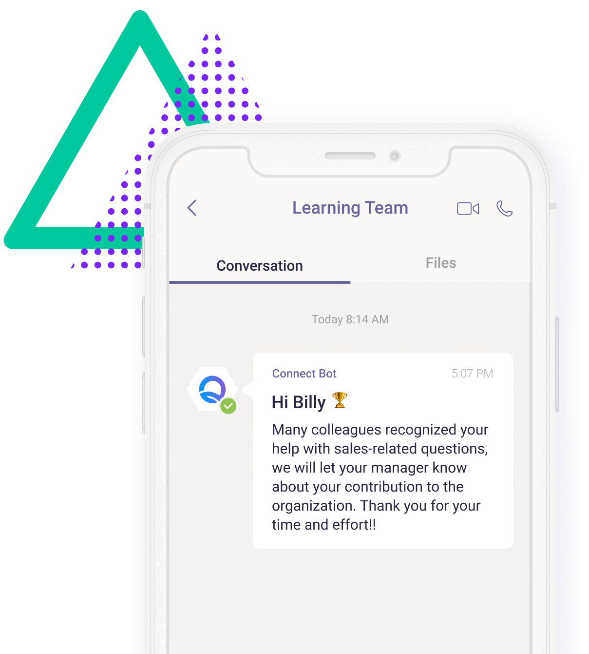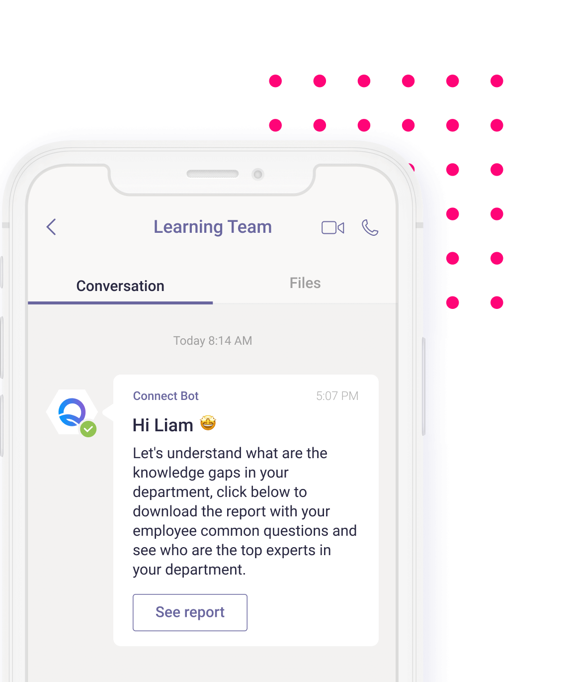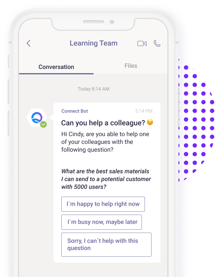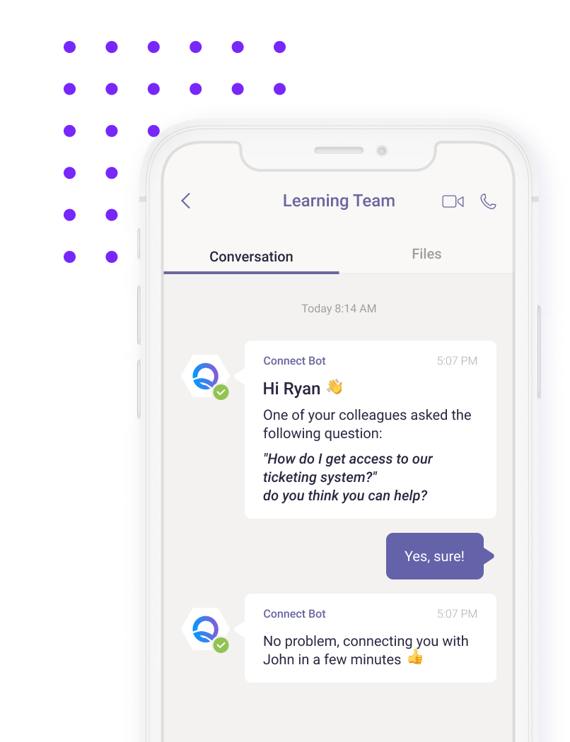 If the question was asked before, we will automatically direct the asker to its solution. If this question was asked for the first time, we will identify the right expert in the organization that is available and can help with the challenge and connect the two employees through Microsoft Teams to work on this together.