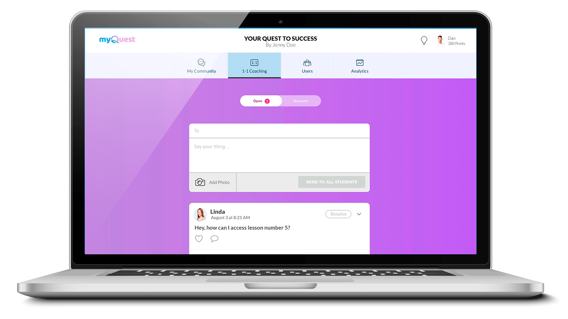 - myQuest’s 1:1 coaching feature enables the instructor to give personal feedback to each one of the students and keep them motivated. Through the 1:1 coaching feature, one instructor can personally interact and train a hundred students in just 30 minutes.